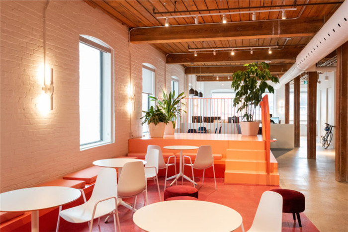 The distinctive white office space is in sharp contrast to the historical wood and brick structures of the existing buildings. Clean and quiet workspaces are broken by rich and colorful social and collaborative spaces. The circular bench is a repetitive theme throughout the space, referring to the company's new logo, the symbol of laughter. The decoration of green plants adds warmth and softness to the office. The three colors used in office decoration design - coral, emerald and navy blue - serve as informal road-finding tools to guide staff and visitors to experience the atmosphere of each space, from social to quiet and meditative.