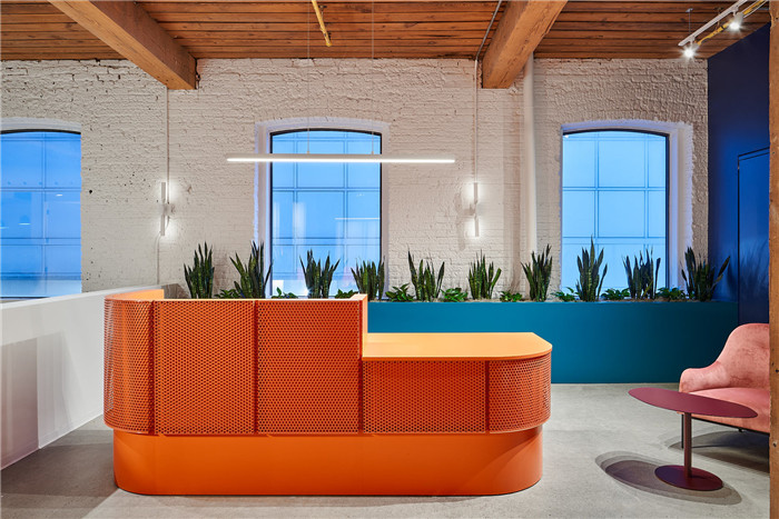 鮮明的白色辦公空間與現(xiàn)有建筑的歷史木結(jié)構(gòu)和磚結(jié)構(gòu)形成鮮明對比。干凈安靜的工作空間被豐富多彩的社交和協(xié)作空間所打破。環(huán)形的長椅是整個(gè)空間的重復(fù)主題,參考公司的新標(biāo)識——笑的符號。綠色植物的點(diǎn)綴給辦公室增添了溫暖和柔和。辦公室裝修設(shè)計(jì)使用的三種顏色——珊瑚色、祖母綠和海軍藍(lán)——作為非正式的尋路工具,引導(dǎo)工作人員和游客感受每個(gè)空間的氛圍,從社交到安靜和沉思。