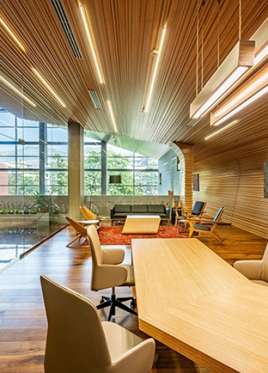 標簽: 律師事務所裝修設計 律師辦公室裝修案例 READ MORENarsi & Associates是一家致力于設計、開發和交付高品質時尚家具產品的制造公司。本案是其位于印度孟買的辦公室,獨特而令人目炫的室內空間由國際知名辦公室裝修設計團隊打造。整個辦公空間以各種建筑體量去個性化其功能區域。橢圓型構筑的幾何體量豐富了開敞的接待大廳的整體視覺,在鏡面般石材地面的映射下,猶如漂浮于水中一般,與此相對的是室外優美的景觀庭院。 接待大廳的一側是一處近