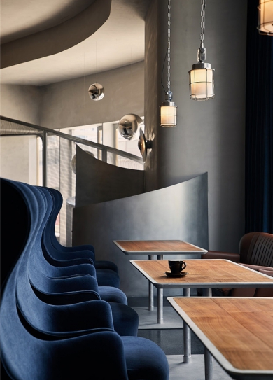 標簽: 豐田辦公室裝修設計 辦公室裝修設計方案 READ MORE三谷是一家綜合業態的餐吧,白天是西餐模式,夜晚則變成一家酒吧。這樣的復合業態,既要保證餐廳的通透性,又要保持酒吧模式相對的神秘感。于是,餐廳裝修設計公司運用斐波那契螺旋線做了一個玄關。螺旋的曲線起到了引導人流的作用,也提供了相對的私密性。金屬網作為隔斷材質,契合主題又保證相對的透光性。 在色彩上專業餐廳裝修公司選擇了大部分的灰色作為基底,為了契合主題,在點綴色上使用了郵輪經典的紅藍配色。