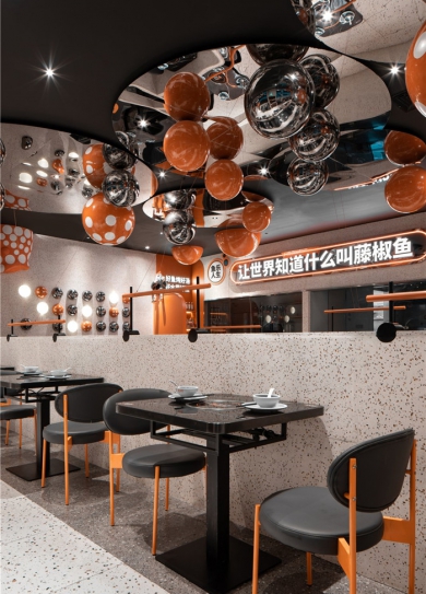 標簽: 茶飲店裝修設計 茶飲甜品店裝修案例 READ MORE對于連鎖餐飲店面裝修設計來說,醒目的標識、令人印象深刻的店面設計是品牌塑造的第一步。魚來坊重慶星光時代廣場店作為該品牌的旗艦店的形象展示,入口保留了主視覺的橙與黑的配色,為整個空間帶來時尚、熱情的調性。專業餐飲店面裝修公司傾力打造“魚男友”的IP形象,強化品牌辨識度與滲透力的同時,提供完全沉浸式的、主題樂園般的餐飲體驗,輕松俘獲年輕女性客戶群體的芳心。下面就跟隨鄭州餐飲店面裝修公司宏鈺堂小編一起來